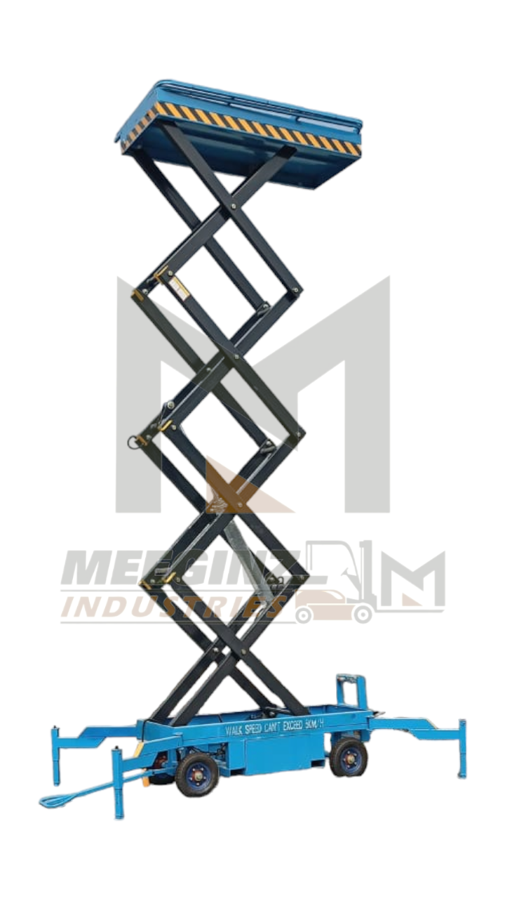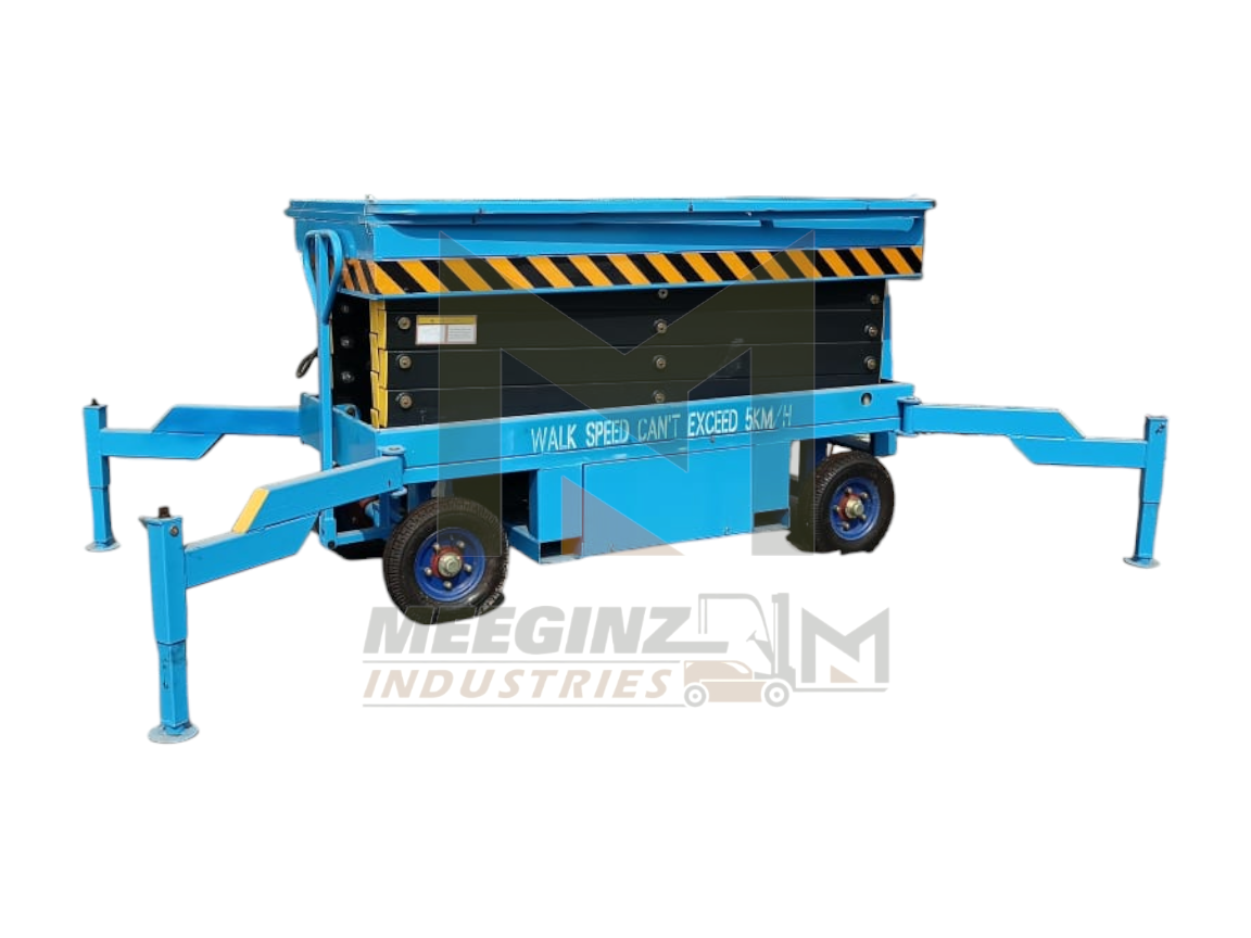 Self-propelled lifts are excellent but can be expensive. Therefore, if you need to reach heights of 10, 12, or even 16 meters on a budget, the Mobile Scissor Lift by Meeginz Industries is the smart choice. Specifically designed for heavy-duty construction and maintenance work, this towable unit provides a massive working platform that can lift multiple workers and their tools safely.